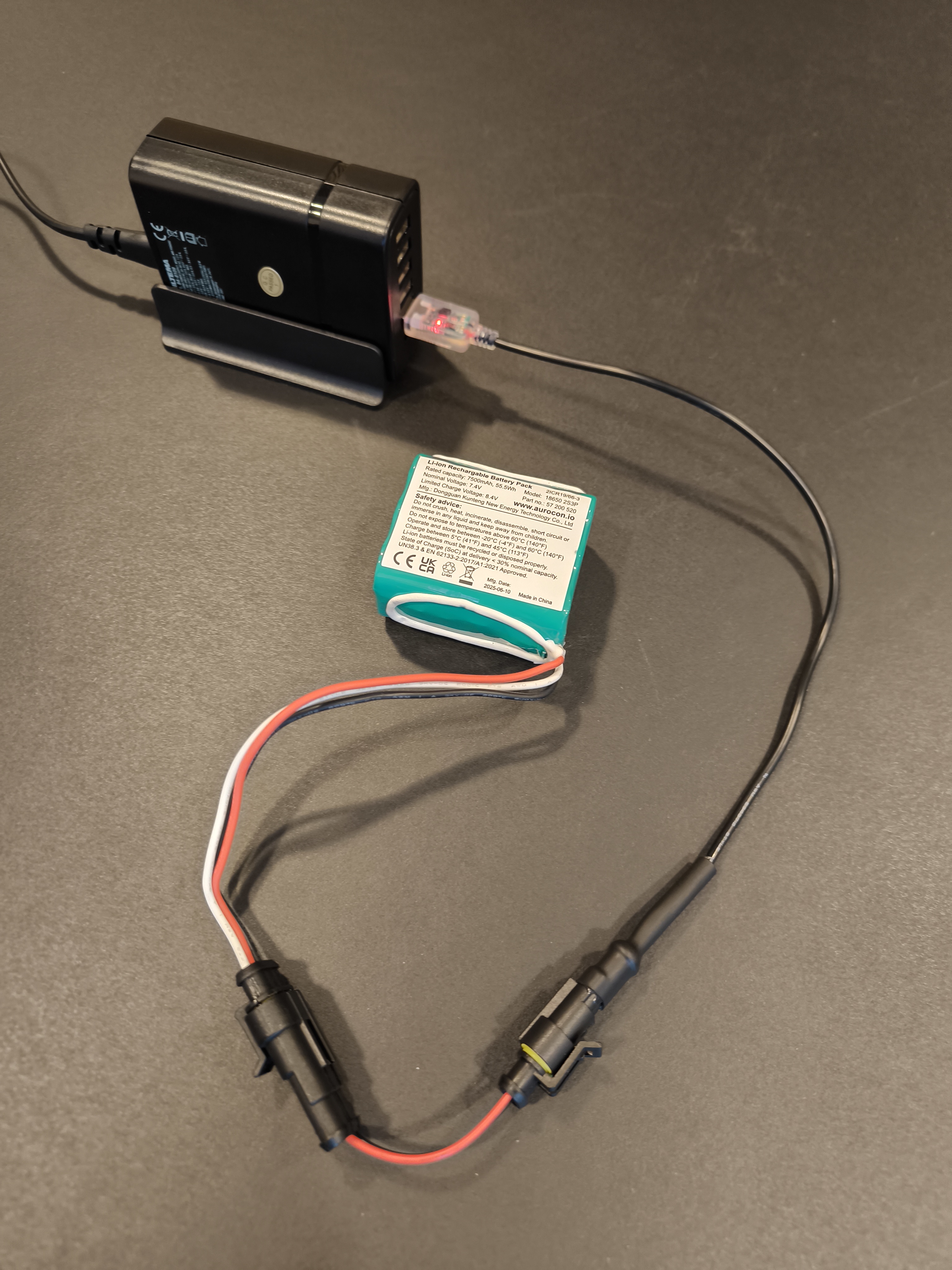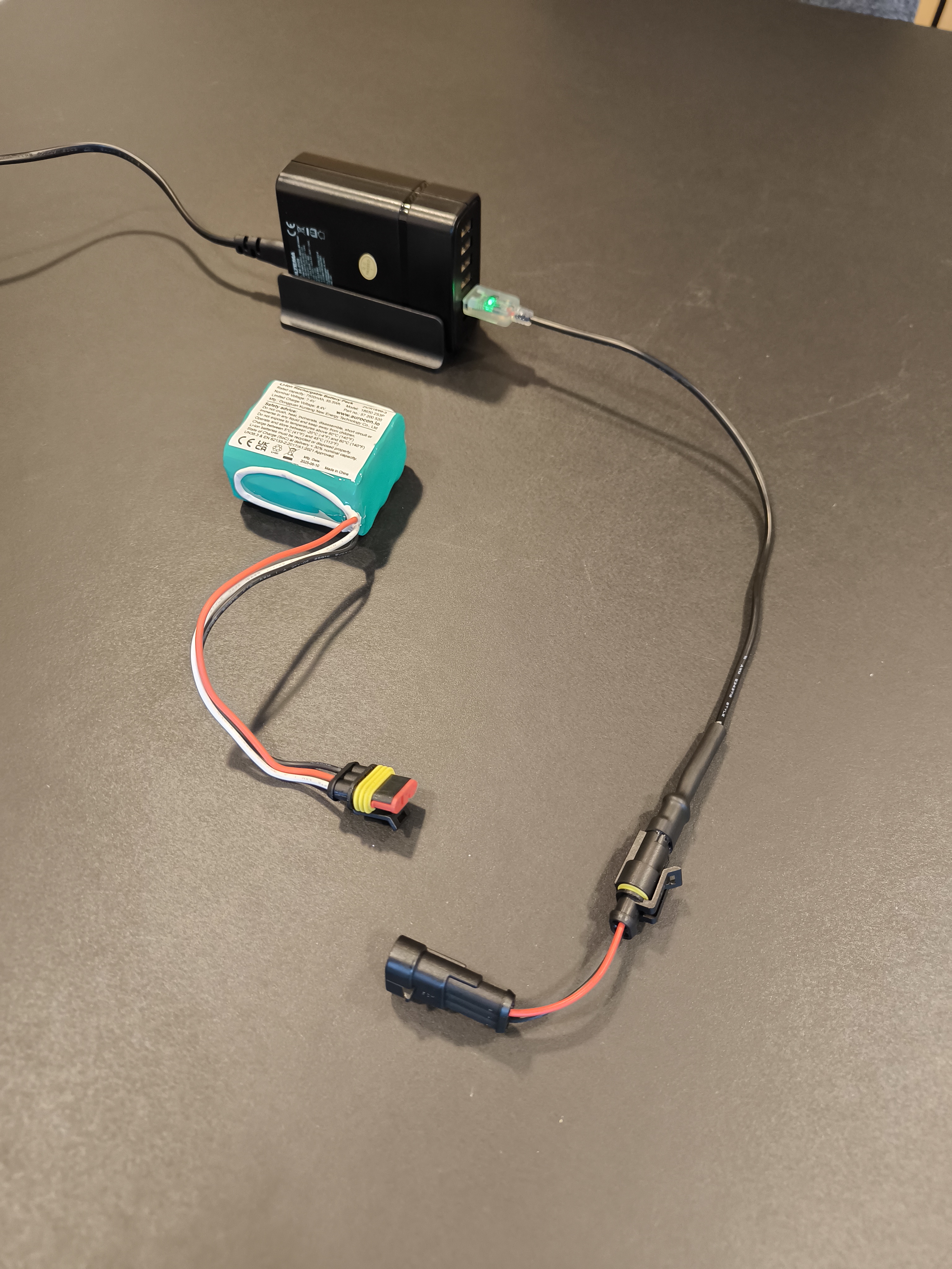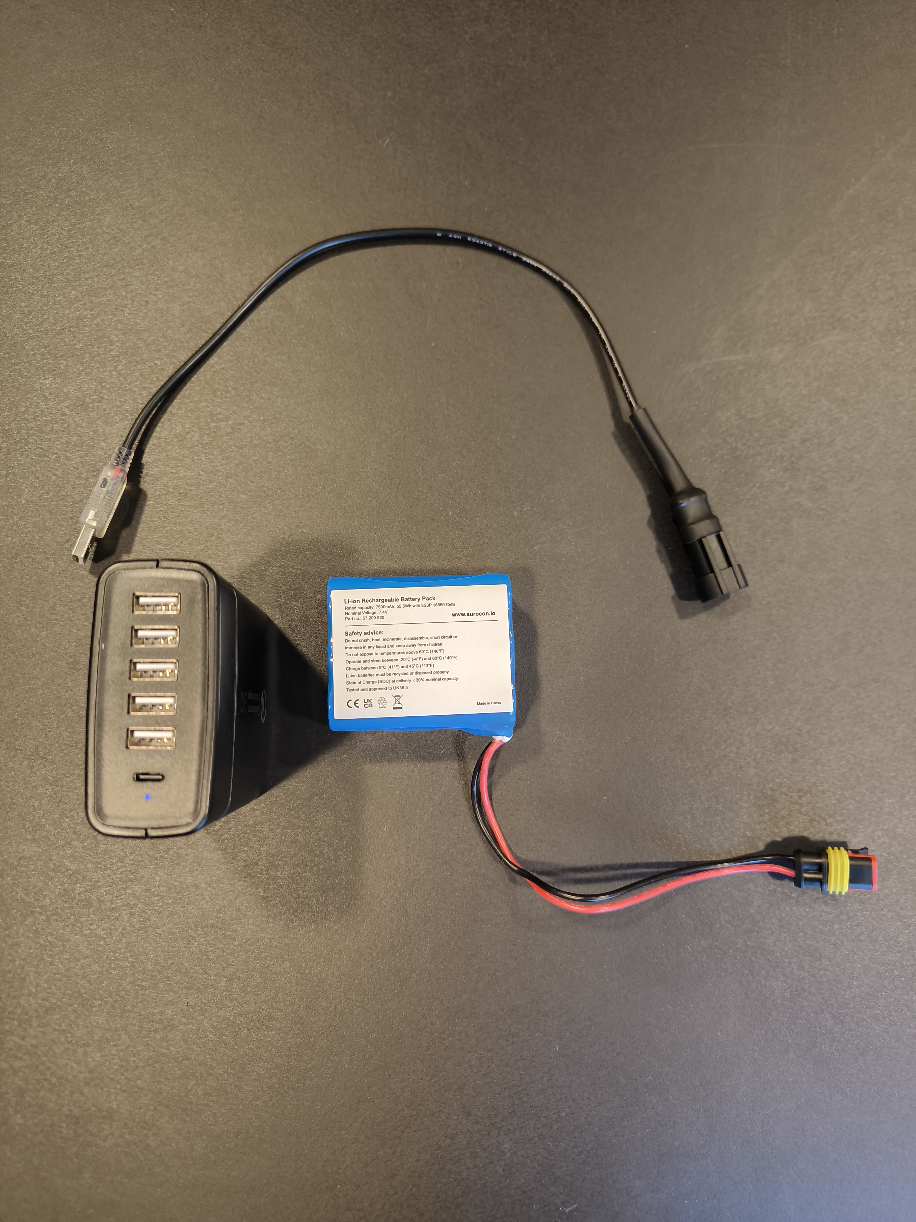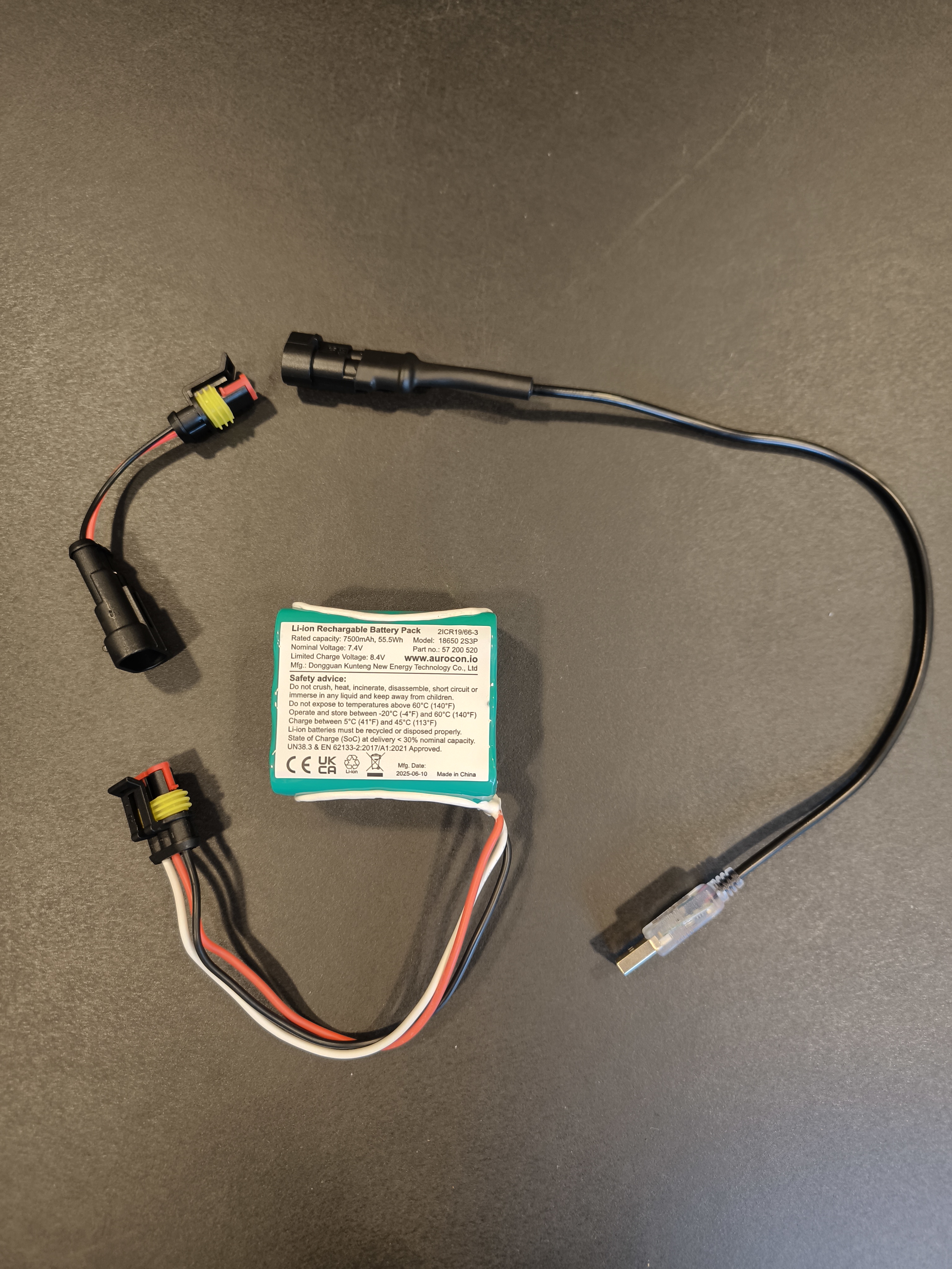 Use the Aurocon adapter cable, which connects from USB-A (charger side) to the battery adapter.